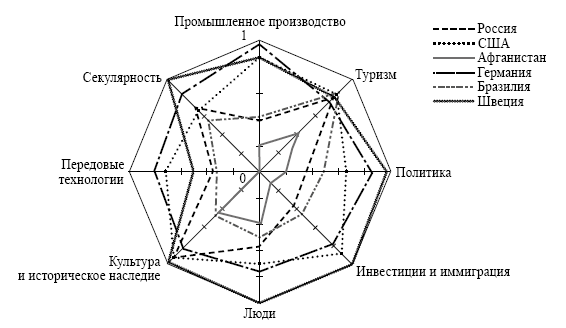 Из рисунка видно, что страны с устойчивой и развитой экономикой и политической демократией (Швеция, США и Германия) обладают существенно более привлекательными имиджами. При этом наиболее привлекательная в суммарном отношении Швеция проигрывает США и Германии по факторам, связанным с промышленным производством. Имидж таких проблемных стран, как Афганистан, близок к нулю. В сравнении с Бразилией Россия выглядит существенно предпочтительнее в области культуры и исторического наследия, а по всем остальным показателям примерно одинаково.
