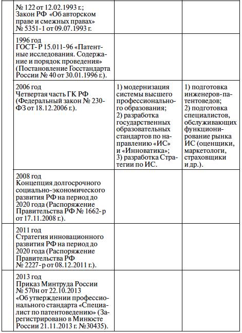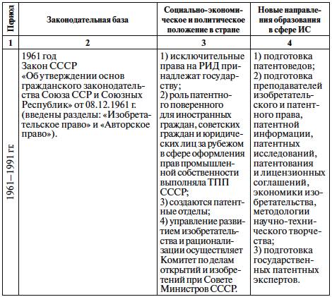 В табл. 1, составленной авторами монографии, представлены периоды формирования системы образования в сфере ИС с учетом социально-экономического и политического положения в стране и действующего законодательства в период с 60-х годов прошлого века по настоящее время.