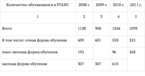 Количество обучающихся студентов в РГАИС за период с 2008 по 2011 год