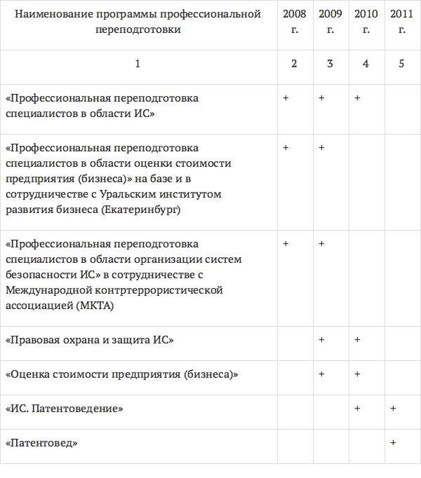 В табл. 3, составленной авторами монографии на основании ежегодных отчетов о деятельности Роспатента, представлены сведения о программах профессиональной переподготовки, осуществляемых в РГАИС с 2008 по 2011 год. В табл. 3 не приведены сведения за 2012 год в связи с тем, что эти данные отсутствуют в отчете о деятельности Роспатента за 2012 год.