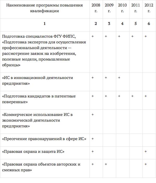 В табл. 4, составленной авторами монографии на основании ежегодных отчетов о деятельности Роспатента, представлен перечень наиболее востребованных программ повышения квалификации РГАИС в период с 2008 по 2012 год.