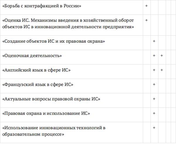 – курсы повышения квалификации (подготовка кандидатов в патентные поверенные, оценка стоимости бизнеса, семинары по вопросам охраны ИС и др.)12.