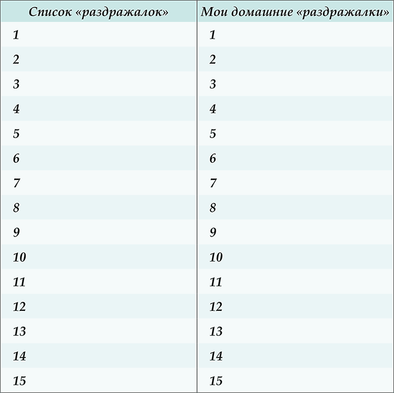 Итак, начинаем искать источники раздражения. Для начала вспомните, что вас обычно раздражает. Не дома, а вообще: в гостях, в офисе, в ресторане – везде, где вы бываете. Напишите список «раздражалок». Очень важно отнестись к процессу как к игре! Как только вы включаетесь серьезно, начинает работать логика. Ответы сложатся из того, что вы думаете и что считаете правильным. А нам нужно добраться до ощущений и реальных раздражителей.