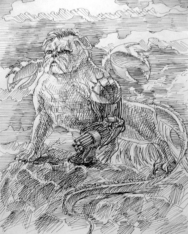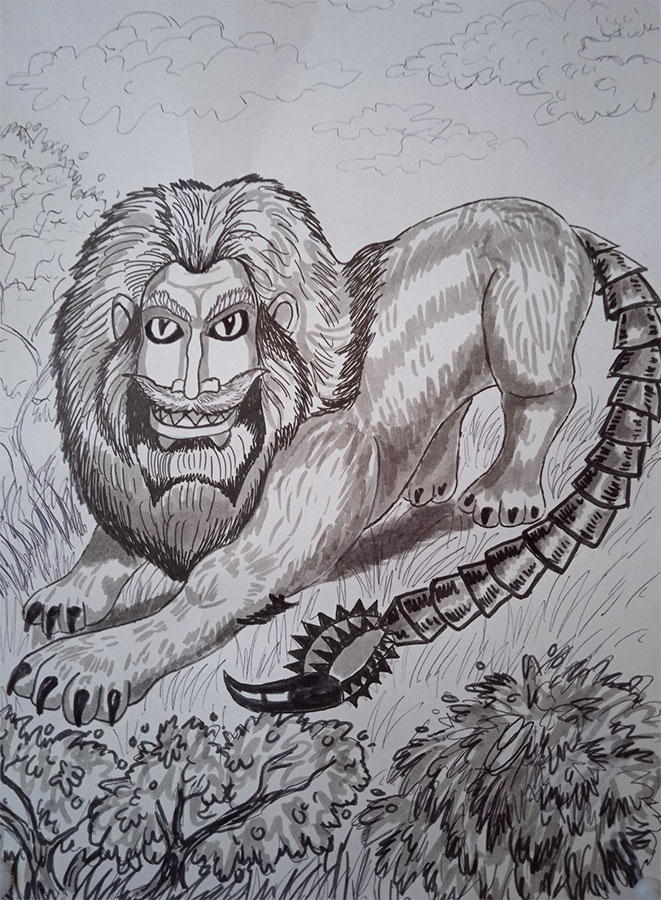 На конце хвоста чудовища росло жало скорпиона, изогнутое серпом. Зверь был тёмно-красного, почти бордового, окраса, а каждая его шерстинка – железной. Впечатляла и шикарная пушистая грива – наверное, пользовался кондиционером как сумасшедший.