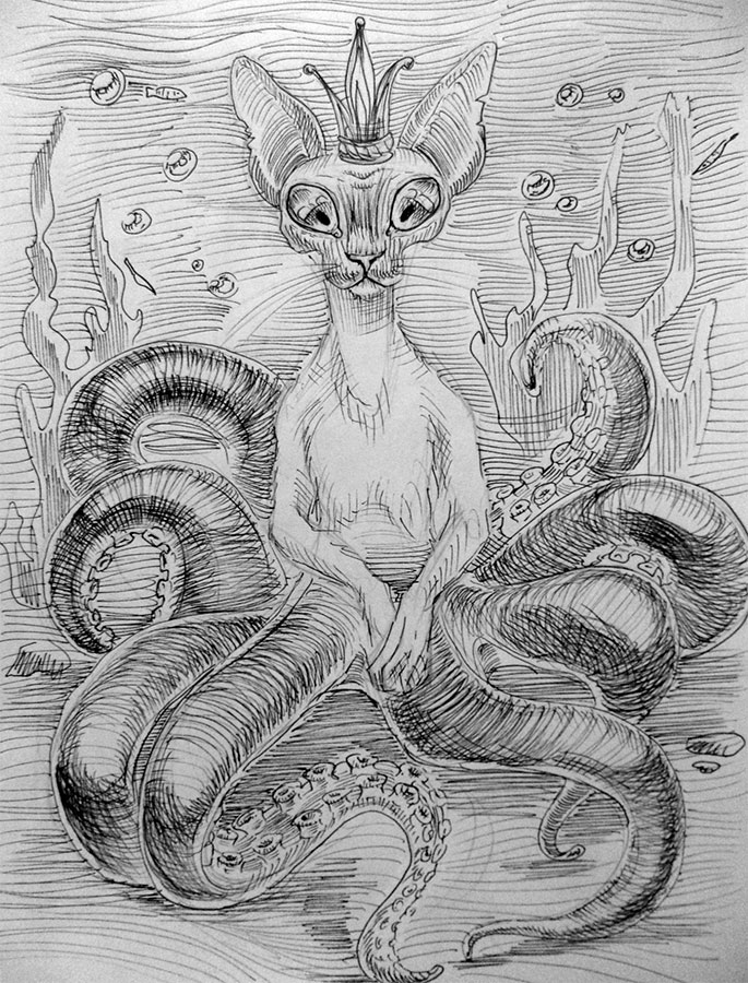На самом же деле в своем истинном обличье, которое мы, котрусы, можем менять по необходимости, я похож на кота размером со взрослого крупного мужчину. Задние конечности у меня в точности, как щупальца осьминога, и их тоже восемь. Уши мои напоминают плавники рыбы, они лишены ушных раковин, что, впрочем, не мешает мне отлично слышать под водой. Глаза у меня без век, а это значит, что я не умею моргать.