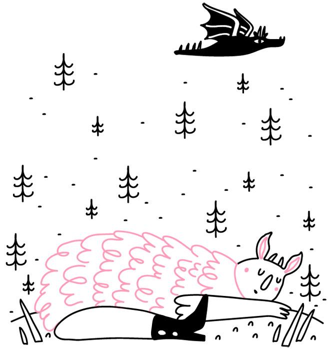 Дракон взмахнул крыльями и полетел в сторону глубокого оврага. Со дна оврага поднимался тоненький, еле заметный дымок. Дракон медленно спланировал к струйке дыма и увидел небольшой костер, а рядом маленькое странное существо, похожее на горку длинных коричневых замшевых лоскутков. Дракон подошел поближе и разглядел под лоскутной шерстью черные глаза, губы трубочкой и треугольные уши.