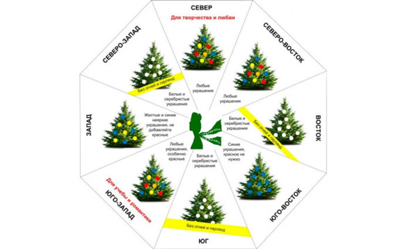 Гораздо важнее чтобы в доме не было старого хлама. Для этого следует тщательно убрать каждый угол, расставшись с вещами, которыми уже давно никто не пользуется. Возможно, это действительно поможет привлечь в дом счастье и удачу. Но даже если вы не очень в то верите, наведение в квартире или в коттедже порядка перед праздником поможет создать надлежащую обстановку в новогоднюю ночь и обязательно улучшить настроение. Расположение елки по фэн-шуй в 2019 году Установка елки по фен шуй в квартире должна проводиться с учетом стороны света. Согласно китайским верованиям, это помогает направить жизненную энергию Ци, пронизывающую все живое, в нужное направление для привлечения достатка, здоровья и личного счастья. Для всех людей Новый год – то начало нового периода в жизни, которое рождает в сердцах людей надежды на лучшее будущее. Многие в это время стараются привлекать удачу по китайскому учению об энергии Ци. Используя правила установки елки по фен-шуй 2019 году, можно создать в доме праздничную и беззаботную обстановку. Не столь важно, какая должна быть лесная красавица на Новый год – искусственная или живая, особое внимание надо уделить месту ее установки и выбору цветовой гаммы. Помощь в украшении жилого пространства окажут советы с фото. Возможно, китайская наука о гармоничном обустройстве дома на время зимнего праздника поможет достигнуть желанных целей в новом году. Живая или искусственная елка? Сами китайцы во время встречи китайского нового года в доме ставят Дерево Света, которое не относится к хвойным видам растений. Поэтому при выборе елки по фен шуй в 2019 году не важно, какая должна она быть – искусственная или живая. Все зависит от личных предпочтений. Если вы не мыслите себе Новый год без хвойного смолянистого запаха, то покупайте вечнозеленое дерево на елочных базарах. На заметку! Если вы противник использования живых деревьев, ставьте искусственную елку. В фэн-шуе это неважно. Самое главное – это расположение празднично украшенного дерева и выбор подходящей цветовой гаммы. Важнее перед установкой елки в доме провести генеральную уборку, выбросив ненужный хлам из дома. Согласно учению фэн-шуй, энергия Ци должна беспрепятственно попадать в дом. Для нее не важно, искусственная или натуральная елка будет стоять в квартире. Интересно: Украшение квартиры своими руками на Новый год 2019 Гораздо важнее чтобы в доме не было старого хлама. Для этого следует тщательно убрать каждый угол, расставшись с вещами, которыми уже давно никто не пользуется. Возможно, это действительно поможет привлечь в дом счастье и удачу. Но даже если вы не очень в то верите, наведение в квартире или в коттедже порядка перед праздником поможет создать надлежащую обстановку в новогоднюю ночь и обязательно улучшить настроение. Расположение елки по фэн-шуй в 2019 году Установка елки по фен шуй в квартире должна проводиться с учетом стороны света. Согласно китайским верованиям, это помогает направить жизненную энергию Ци, пронизывающую все живое, в нужное направление для привлечения достатка, здоровья и личного счастья. В Китае существует ряд рекомендаций для установки Дерева Света в новогодний праздник, следование которым помогает добиться самых желанных целей: Те, кто хотел бы в наступающем году получить общественное признание, упрочить свою репутаци