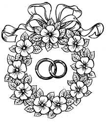 Возьмите и нарисуйте по краям сердечки вперемежку с цветами. Или нарисуйте сердечки и в середине их – обручальные кольца. Нарисуйте два колечка, заходящие друг за друга, между ними – цветы, а внизу – сложенную в складки ленточку.