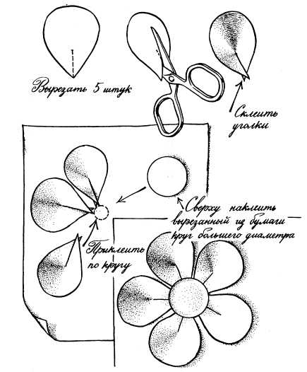 Каждый лепесток надрезают снизу вверх посередине (см. рисунок) и наклеивают один уголок на другой, чтобы цветок получился выпуклым. На бумаге рисуют маленький круг, к которому подклеивают лепестки. Сверху на лепестки приклеивают вырезанный круг большего диаметра, чем нарисованный. Ну а если у вас мало времени, вырезайте цветы из старых поздравительных открыток, которые непременно найдутся в любом доме.
