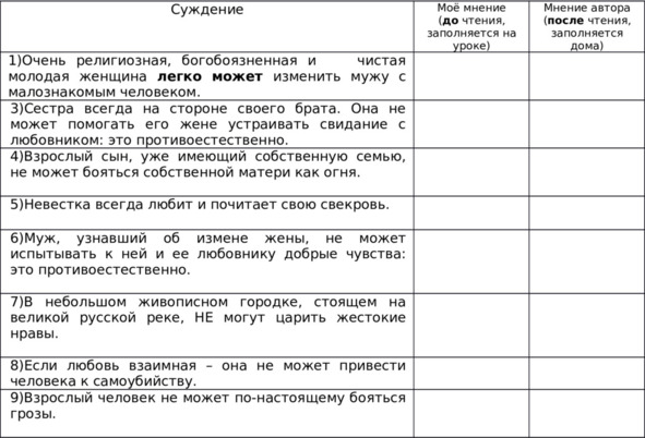 – Именно! Пьесу нужно прочитать к следующему уроку непременно, обнаружить указанные в таблице вопросы и заполнить ТРЕТЬЮ колонку. Во время чтения ваша задача – выявить, как сам автор отвечает на них на примере своих героев.