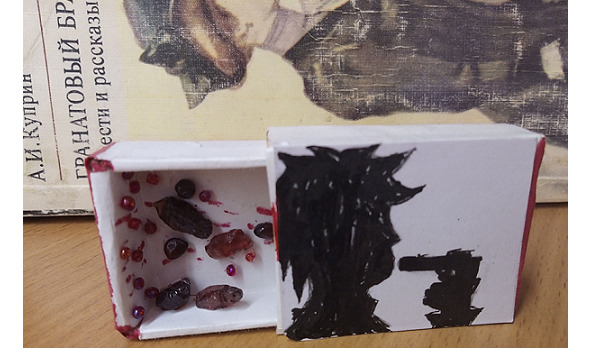 Творческая работа по мотивам повести А.И.Куприна «Гранатовый браслет». Открываешь коробок – гранатовые сгустки крови Желткова заставляют вспомнить слова: «Любовь должна быть трагедией, величайшей тайной в мире»