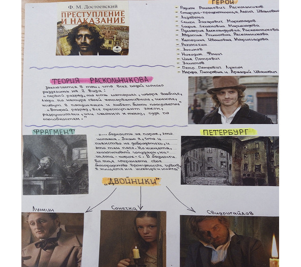 Это конспект урока, но вот в такой творческой форме. Особенно интересно тем, кто блестяще рисует. Я, к сожалению, не могу похвастаться этим талантом, поэтому ограничиваюсь рисунками-символами: сердце (для любовной линии), огромный топор (при анализе образа Раскольникова), халат или шинель (догадайтесь, какие произведения), монетки, стрелки, облако с грозой и прочее (подробнее об этом в отдельной главе).