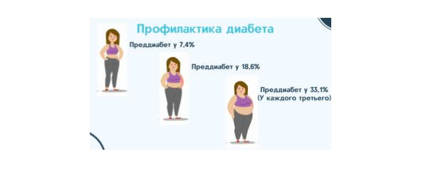 Уже давно всем понятно, что диабет 2 типа четко связан с избытком веса и ожирением. По результатам Всероссийского исследования NATION (2014г): доли участников с преддиабетом и сахарным диабетом 2 типа увеличивались по мере увеличения веса. Например, преддиабет при нормальном весе был выявлен у 7,4% (и такое возможно, при нормальном весе!), при избытке веса у 18,6%, а при ожирении у 33,1%, т е каждый 3 имеет скрытый диабет. Это только преддиабет, а сколько с уже установленным диагнозом!
