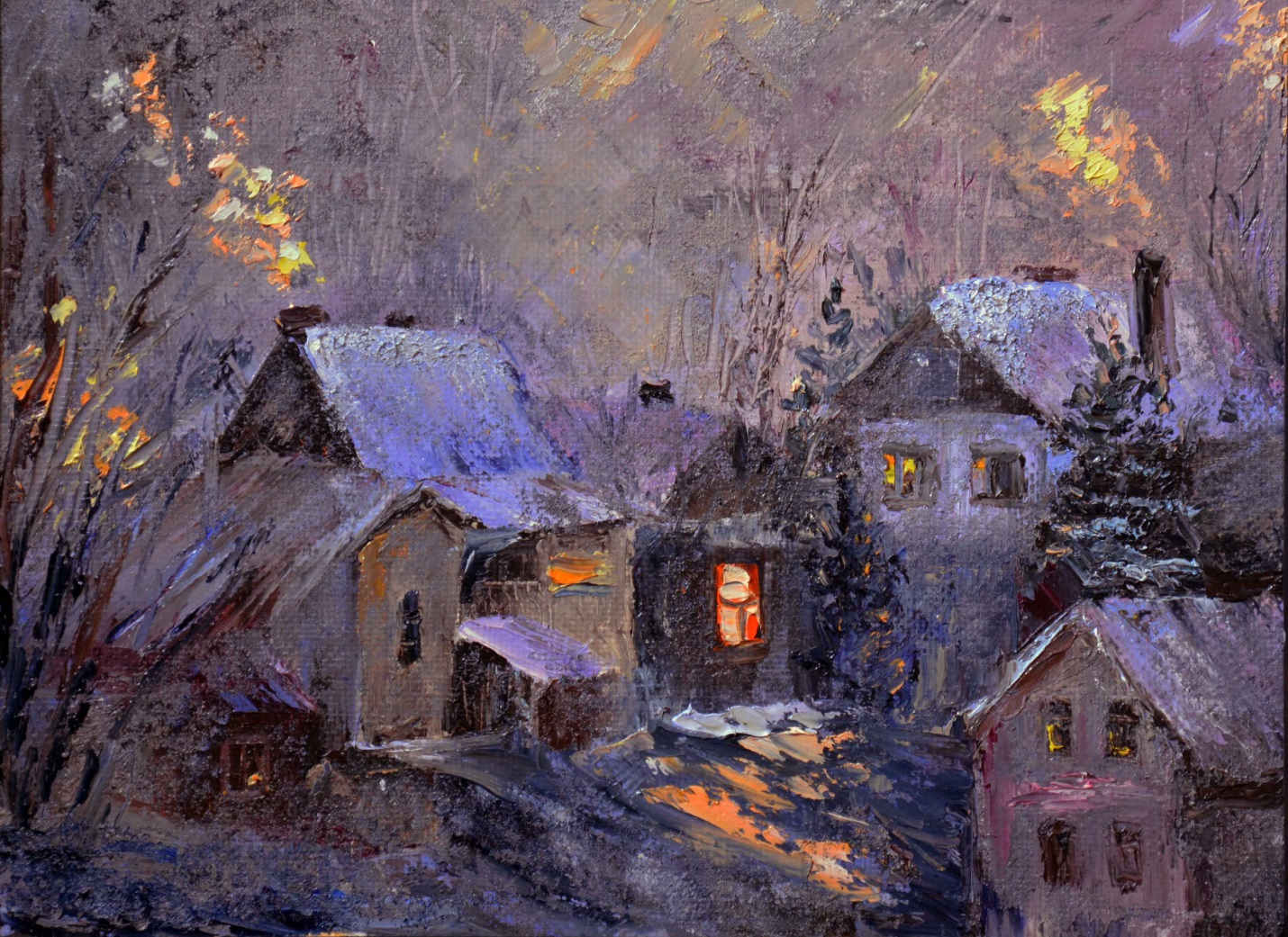 Электричка в пригороде Каунаса идет себе, покачиваясь, стуча на стыках рельсов железными ногами. Мороз крепкий, все замело, и дымы. В окне домики светятся оранжевым, подкрашивая в темном небе угольный дым белых труб.