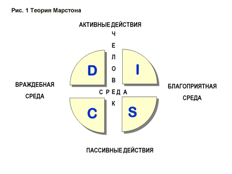 В ходе исследований Марстон пришел к выводу, что поведение людей может быть описано при помощи двух координат, где одна ось показывает степень активности самого субъекта (активное – пассивное действие), а вторая – модальность окружающей среды, в которой совершается действие (благоприятная – враждебная). Располагая эти оси под прямым углом, Марстон выделил четыре квадранта, каждый из которых отражает определенный поведенческий тип: «Доминирование» (D), «Воздействие» (I), «Постоянство» (S), «Соответствие» (С). (см. рис. 1.)