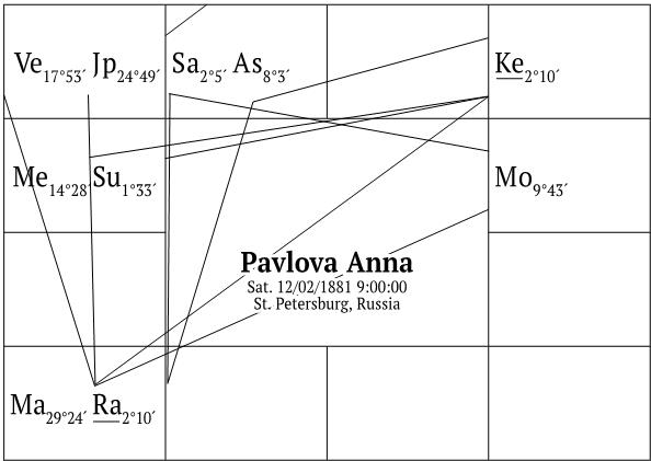 Лагнеша – Марс, первый дом – Овен. Марс стоит в 9-м доме вместе с Раху. Марс имеет аспекты от себя на 4-й, 7-й и 8-й дома. Если мы посмотрим эти аспекты, то Марс имеет аспект на 12-й дом в карте (Венеру с Юпитером), на 3-й дом (Кету), на 4-й дом (на Луну). То есть с одной стороны Марс как Лагнеша это благоприятная планета, но он еще и хозяин 8-го дома (дома смерти). Смерть Анны Павловой была загадочной, она много трудилась и умерла перед выходом на сцену от воспаления легких. Марс, который аспектирует Кету в 3-м доме, – это легкие, Луна в 4-м доме – это грудная клетка, еще неблагоприятно соединение Марса с Раху.