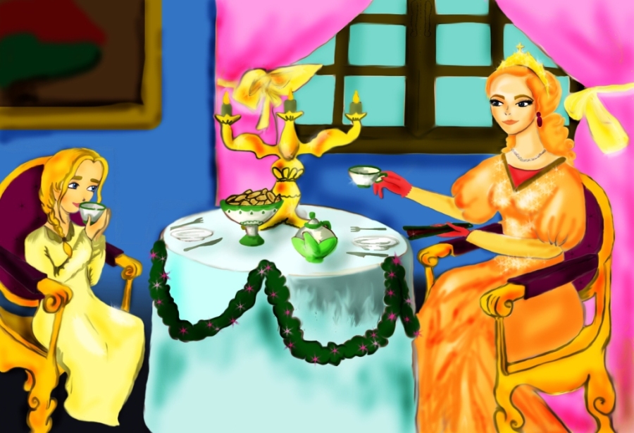 Разместилась удобно на печи Полинка, зажгла воск в баночке и откинула лоскутное одеяло. Потянулась за матрёшкой, но не тут, то было. Кубышка заморгала нарисованными глазками, ловко спрыгнула с печи на лавку, с лавки на пол и покатилась к корзине с овощами. Когда девочка подошла к овощам, матрёшка уже сидела на большой оранжевой тыкве. Вспыхнула тут тыква пламенем охваченная, стала расти в огне и, кружась молниеносно, превратилась в золотую карету, размером с сундук. Тронула Полинка кончиком пальца волшебный экипаж и зажмурилась от боли, так обожгло её. Да только тут же очутилась она на ночной дороге возле дома, а карета выросла до размеров настоящего элегантного экипажа с бесподобными першеронами с плюмажами. Дорогой из дерева золоченый экипаж особенно сверкал в ночи. Всюду была роскошная рельефная резьба в виде цветов, масок, воинских доспехов и причудливая живопись. Ручки кареты были усыпаны стразами. Занавеси и обивка были из бархата. На крыше кареты красовалась корона – символ принадлежности к царскому двору. Зеркальная дверца отворилась и из кареты вышла, грациозно подав руку в атласной перчатке вышколенному, одетому в ливрею, кучеру высокая молодая особа с голубыми глазами, курносым носиком, белоснежной кожей лица и светлыми с рыжим отливом волосами. Платье её было из тонкой парчи с отделкой из дорогих кружев, вышитое золотом и серебром. В головном уборе блистали бриллианты.