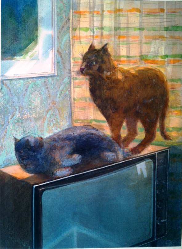 «Мартин, мне очень хотелось бы прогуляться с тобой по крыше, но та вода, которая льется с неба, портит не только всякое удовольствие от прогулки, но и красоту моей серой шубки. Если хочешь, прыгай сюда на тёплый играющий ящик, помурлыкаем и хвост посушишь заодно».