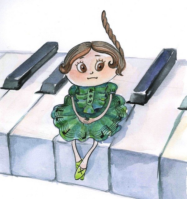 И тут же на краю немой клавиши девочка заметила крохотную малышку. Она была в ярком зелёном платьице. Её гладко зачёсанные волосы были собраны на затылке в аккуратный высокий столбик. Незнакомка открывала рот без звука, но удивительное дело, Слава всё слышала!