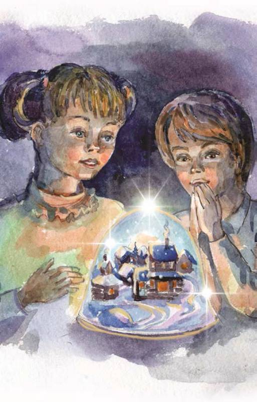 — Посмотри! — сказала сестра. — Наш любимый подсвечник! От него так уютно, когда он светит в темноте. Подсвечник был очень красивый, в форме колокола, у основания которого затерялась заснеженная деревенька. Белый снег пушистой периной лёг и на деревья, и на крыши деревянных домиков. А большие сугробы почти полностью скрыли все изгороди. Над спящими под снегом домиками синела звёздная ночь. Когда в подсвечник клали и поджигали свечку окошечки в домиках и звёздочки начинали сиять, потому что не были раскрашены и свет свечи проходил через них свободно.