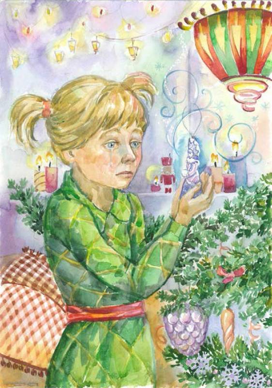 Саша потеряла счёт времени. Она не знала, сколько проплакала и теперь стояла в полной растерянности. Девочка даже боялась пошевелиться. Вдруг раздался мелодичный звук, как будто кто-то позвонил в крохотный колокольчик. Нижняя ветка ели слегка качнулась. На ней висела игрушка Снегурочки в белоснежной расшитой жемчугом шубке, с восьмилучевым венцом на голове. Ручки Снегурочки прятались в муфте. Игрушка покачала головой. Саша задержала дыхание от волнения. Снегурочка вытащила тонкую руку из муфты и прозрачным пальчиком поманила Сашу к себе. Девочка на несгибающихся ногах послушно пошла к ёлке.
