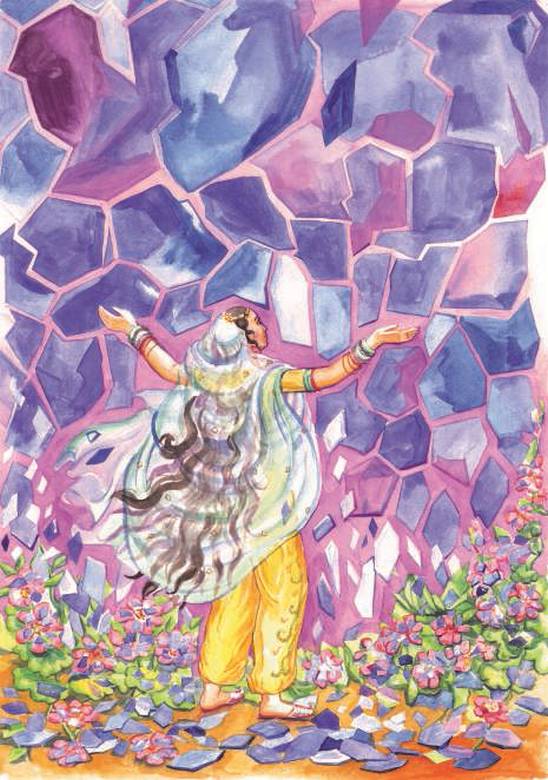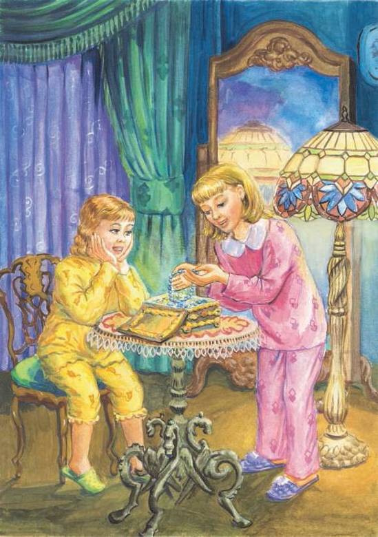 Брызги разноцветных огоньков рассыпаются в разные стороны. Вспыхивают и гаснут радужные сверкающие поверхности кристаллов. Синий, голубой, красный, розовый, зелёный, жёлтый… Все цвета сливаются в одно большое многоцветное кружение. И только потом, когда бабушка начинает осторожно вынимать свои украшения, мы видим, что это не просто огоньки, а серьги, кольца, броши, кулоны и бусы.