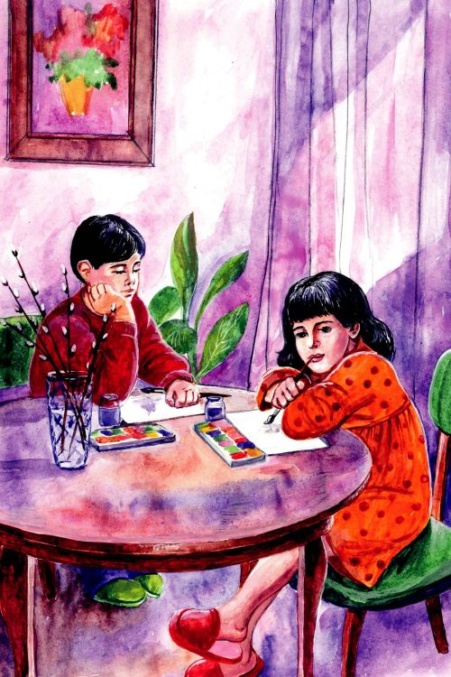 Когда бабе Вале некогда с нами заниматься, чтобы быть уверенной в том, что мы ничего не натворим, она выдаёт нам кисточки, краску и бумагу. Ставит что-нибудь на стол и просит это нарисовать. Но делает она так не часто, потому что, бывает, после таких рисунков ей приходится делать генеральную уборку в комнате.