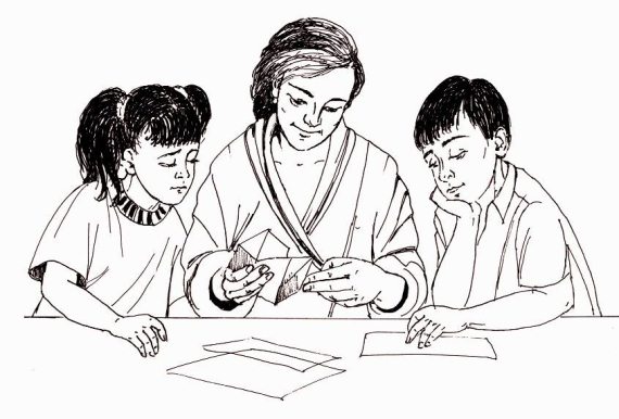 Тёмка засопел, но ничего не ответил. В этот момент в комнату заглянула тётя Оля: она сразу поняла, что ничего у нас не выходит. Сев за стол, она взяла бумагу, линейку и карандаш. Сначала сложила бомбочку сама и отложила в сторону. Взяла ещё один лист и аккуратно начертила линии сгиба. Протянула лист мне.