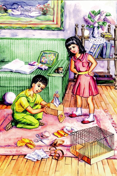 Я быстро поднялась наверх. Смотрю, а у него клеточка на полу стоит. В клеточке коробочка с круглой дыркой. По краям две кормушки с какими-то зёрнышками висят, а ещё мисочка с водой стоит.