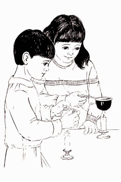 Мы зажгли свечки, налили в кастрюльки воду и высыпали манку.