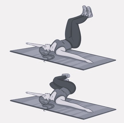 Исх. положение: лежа на спине, руки в стороны, ладонями вниз (держимся за пол), ноги согнуты в коленях на весу (голени параллельно полу). Держи колени вместе и поочередно опускай ноги направо к полу, а затем налево к полу. Сделай 60 таких перекатов