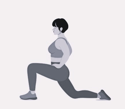 Растяжка передней поверхности бедра. Сделай широкий низкий выпад вперед одной ногой и толкай таз вниз, к полу. Колено другой ноги лежит на полу. Держи спину прямой и постарайся расслабить таз и ноги. Следи за положением колена той ноги, которая спереди – колено не должно «заходить» за носок. Держи положение 1-1,5 минуты, затем поменяй стороны.
