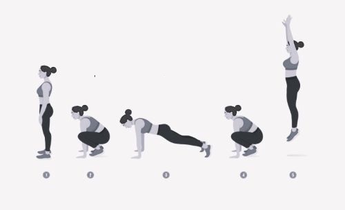 Выполняем глубокий присед, ладони на коврик. Перенося вес тела на руки, отпрыгиваем назад, в положение «планка». Опционально можно добавить на этом этапе упражнение «отжимания от пола», не “проваливая” поясницу к полу. Поясница должна быть четко зафиксирована. Если тяжело, то можно опустить колени на пол и отжаться с колен. Далее прыжком возвращаемся в «присед» и «выпрыгиваем» наверх. Повторяем упражнение 20 раз.