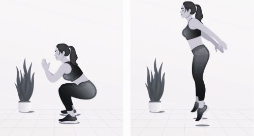 Исходное положение: стоя, стопы на ширине бедер. Выполняем глубокий присед, затем, не задерживаясь, выполняем прыжок вверх. 3 подхода по 12 раз.