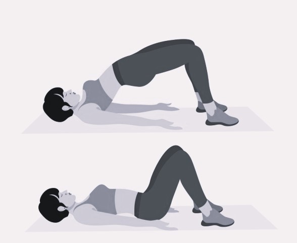 Исх. положение: лежа на полу, ноги согнуты в коленях, носки стоп и колени направлены вперед, колено находится над пяткой, стопы на ширине таза. На выдохе мягко отрываем таз от пола. На вдохе – так же плавно опускаем его вниз. 50 раз без перерыва.