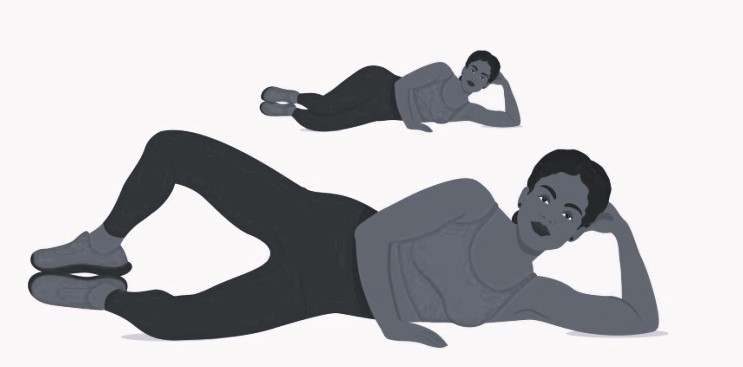 Исх. положение: лежа на боку, рука под голову (здесь можно просто удобно лечь). Корпус, таз и ноги в одну линию. Совершаем махи по направлению вверх-вниз плавно и медленно 30 раз без перерыва. Колено прямое. Затем поменяй стороны (итого по 30 раз на каждую сторону).