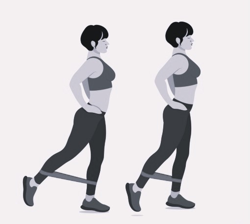 2) Махи ногами, усиленные резинкой. Исходное положение: на четвереньках, резинка располагается на бедрах, немного выше коленей. С выдохом поднимаем согнутую ногу вверх, пятка направлена в потолок. Затем согнутую ногу опускаем вниз, накрест с голенью противоположной ноги. 2-3 подхода по 20-30 раз на каждую ногу.