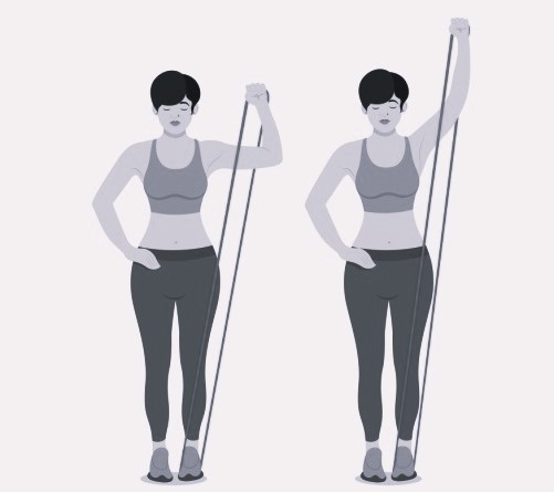 9) Упражнение для укрепления плечевого пояса с помощью фитнес-резинки. Исходное положение: стоя, стопы на ширине плеч, один конец резинки – под стопой, другой – в руке. Расположи одну руку на поясе, другую, с фитнес-резинкой так, как изображено на картинке (локоть на уровне с плечом, предплечье вертикально). С выдохом выпрями рабочую руку вверх , затем вернись в исходное положение. 2-3 подхода по 8-12 повторений.