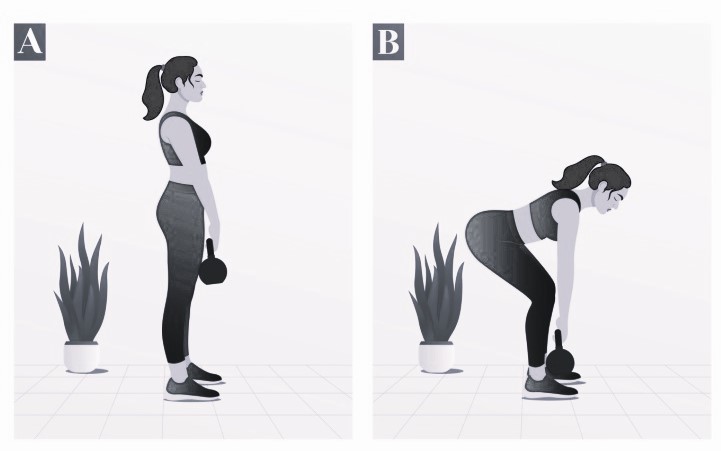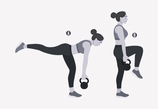 13) «Румынская тяга» на одной ноге с гирей. Исходное положение: стоя на одной ноге, в противоположной руке – утяжелитель (кстати, можно в двух руках). С вдохом наклоняемся вперед, опуская гирю (утяжелитель) к полу до тех пор, пока нога не будет параллельна полу, затем, с выдохом, поднимаемся наверх. Повтори необходимое количество раз, затем поменяй стороны. 3 подхода по 12-20 раз.