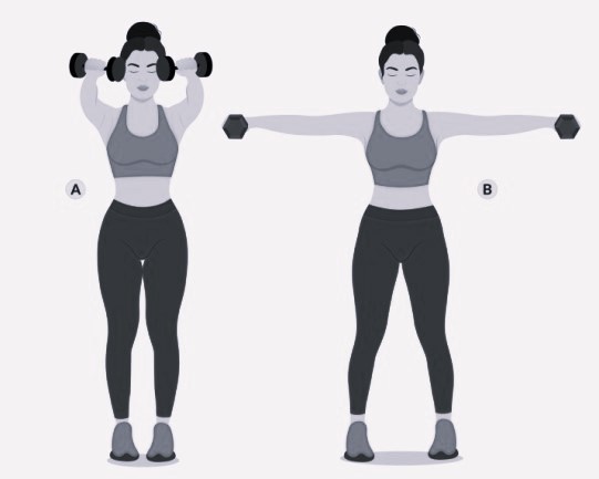 4) Махи руками с гантелями (утяжелением). Исходное положение: стоя, спина прямая, взгляд- перед собой, в руках – гантели (здесь я не советую брать большой вес. Гантели весом 0,5-1 кг вполне подойдут). Вытяни руки с утяжелителем (гантелями) прямо перед собой, на уровне плеч. Далее разведи руки в стороны, затем, с выдохом, верни руки в положение «вытянуты перед собой». Делай подход без перерыва, не опуская руки (это важно). 3 подхода по 20-30 раз. Для чего это упражнение нужно? Для красивых рук и хорошего кровообращения в плечевом поясе.