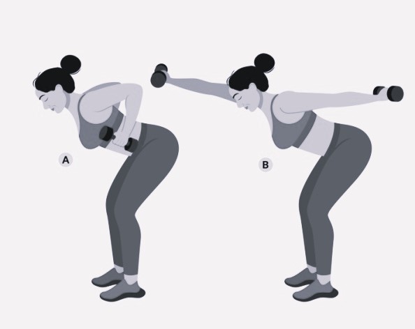5) Тяга гантелей в наклоне. Это упражнение для рук, плеч, грудных мышц и спины (при условии правильной техники). Здесь, в зависимости от задач, можно взять для работы любой вес. Гантели большого веса и малое количество повторов в подходе, если хочется «увеличить объем мышц», и гантели малого веса, но с большим количеством повторов, если хочется «постройнеть». Итак, исходное положение: стоя, ноги на ширине бедер, спина с небольшим прогибом, в наклоне (диагональ), в руках –гантели, локти прямые. С выдохом, держа локти близко к корпусу, подводим гантели к груди, а с вдохом – возвращаем в исходное положение. 3-5 подходов по 6 (в случае с большим весом) – 20 раз (если гантели малого веса).