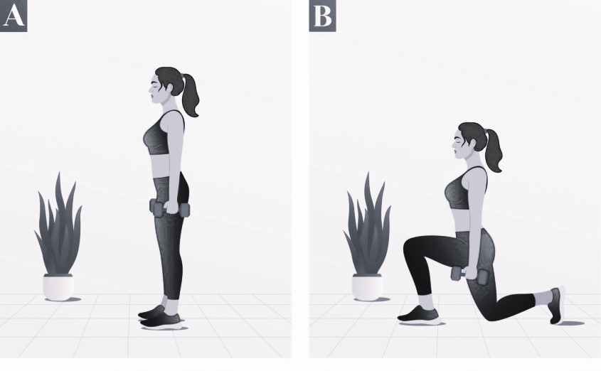 8) Выпады с гантелями. Исходное положение: стоя, спина прямая, в руках – утяжелитель (гантели, гири). Выполняем широкий шаг назад так, чтобы колено ноги, которая осталась впереди, не заходило за носок и сохраняло угол боле 90 градусов, коленом ноги, которая сзади, мягко касаемся пола. Далее возвращаемся в исходное положение, и меняем стороны. 3 подхода по 12-20 раз на каждую ногу.