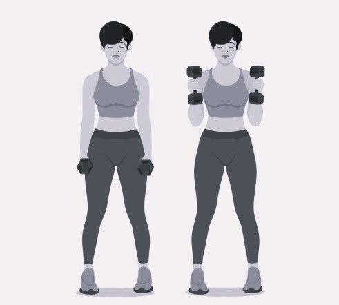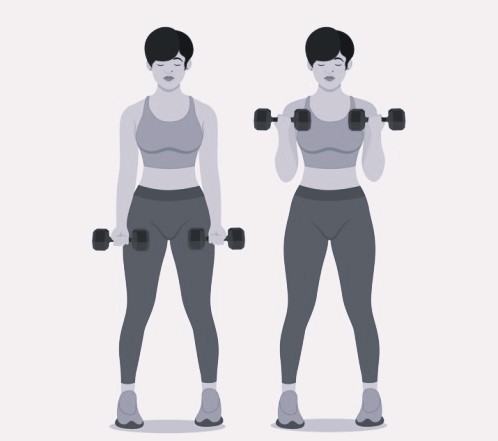 9) Упражнение на бицепсы с гантелями. Классика жанра. Все знают это упражнение. Сразу хочется предостеречь от ошибок: держи корпус статично! Самая распространенная ошибка – «проваливаться» в пояснице и «болтать» корпусом при подъеме гантели. Если не получается зафиксировать корпус неподвижно – возьми меньший вес. Исходное положение : стоя (можно и сидя, кстати), спина прямая, в руках – гантели. С выдохом , не расставляя локти широко (держи их ближе к корпусу), притяни гантели к груди. С вдохом – плавно вернись в исходное положение. 3 подхода по 15-20 раз. Можно, кстати, взять гантели другим хватом (на картинке 2) и чередовать виды упражнения (чтобы не скучно было)