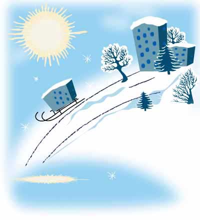 Котя сидел на голубеньких санках-ледянках на краю крутого снежного спуска.
