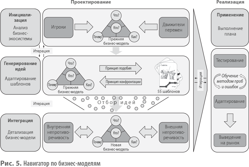 Навигатор по бизнес-моделям (рис. 5) представляет собой методологию с упором на активные действия, позволяющую любой компании выйти за рамки доминирующей отраслевой логики и вывести бизнес-модель на новый уровень. Мы доказали ее эффективность во всех типах компаний, организаций и сферах. В ее основе заложена следующая идея: успешные бизнес-модели разрабатываются посредством творческого воспроизведения и рекомбинации.