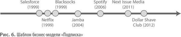 Подписка (рис. 6) позволяет клиентам платить ежемесячный или ежегодный взнос (почему), чтобы иметь доступ к товару или услуге (что). Хотя упомянутый шаблон существует уже многие годы, он все равно может обеспечить радикальную инновацию, если поместить его в новые контексты. Например, Salesforce, компания, предоставляющая услуги в облачной системе управления базами данных, произвела настоящую революцию в своей сфере, став первой софтверной компанией, которая предлагала подписку вместо разовой продажи лицензий по фиксированной цене. Подписки на программное обеспечение помогли Salesforce войти в десятку самых быстрорастущих компаний в мире.