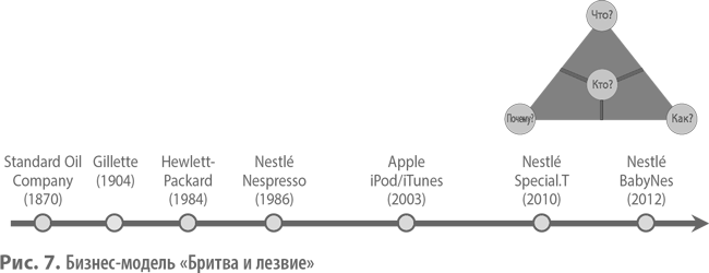 Центральная идея шаблона «Бритва и лезвие» (рис. 7, также см. часть II) – дешево или вообще бесплатно предлагать покупателям основной товар, а комплектующие и расходные элементы, необходимые для его использования, продавать по очень высоким ценам (что, почему). Чтобы покупатели гарантированно обращались за покупками в изначальную компанию, необходимо позаботиться о барьерах выхода, например патентах, или мощном брендинге (как). Считается, что первой концепцию «Бритва и лезвие» реализовала компания Джона Рокфеллера Standard Oil Company. В конце XIX в. она продавала дешевые керосиновые лампы, а к нему дорогое масло, производимое на собственных нефтеперерабатывающих заводах. Несколько лет спустя этот шаблон перекочевал в производство бритв и лезвий, откуда и пошло его название. Компания Gillette бесплатно раздавала бритвенные станки, а на соответствующие сменные лезвия выставляла высокие цены.
