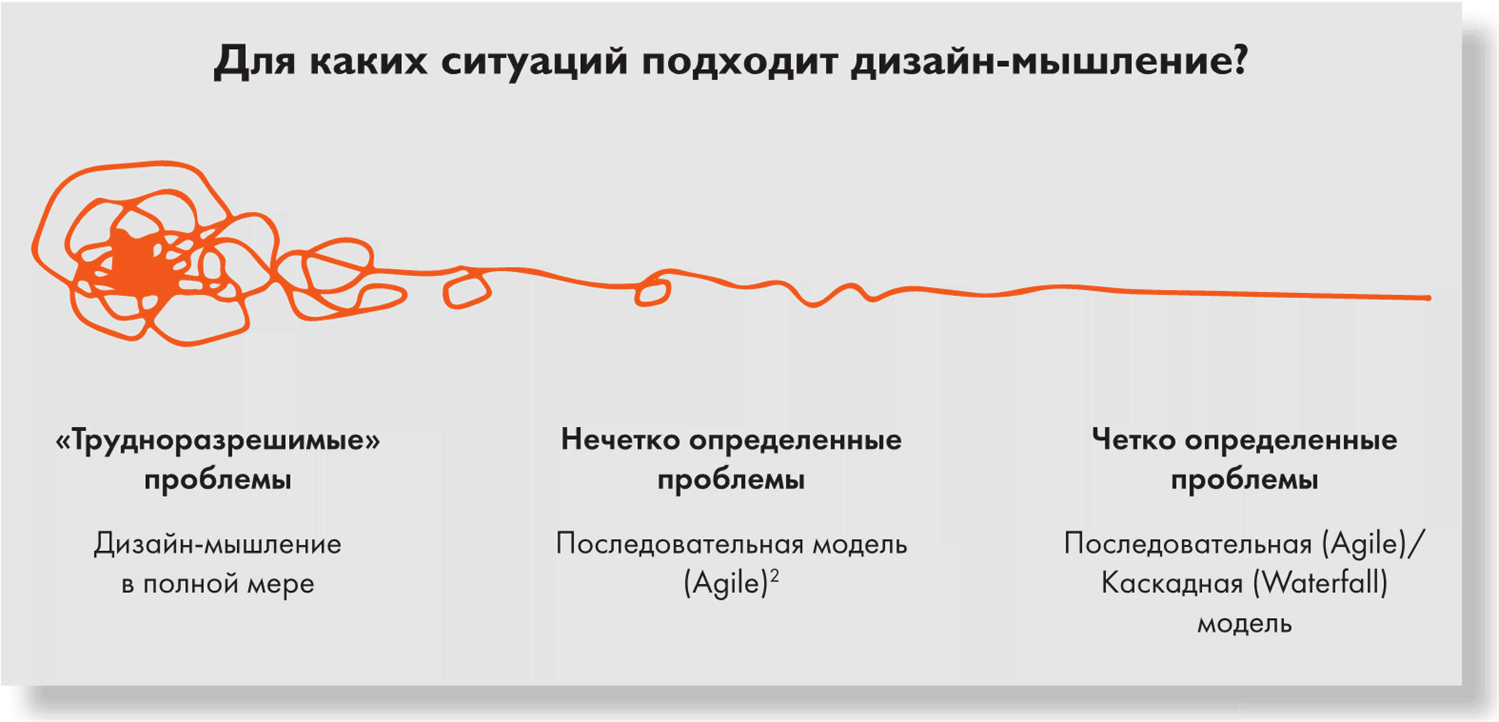 Дизайн-мышление – это не четкий порядок действий или набор стандартов и шаблонов. Оно не предназначено заменить ни стандартные инструменты развития организации, ни сквозные бизнес-процессы, ни методы управления проектами. Скорее, дизайн-мышление работает внутри структуры управления проектами, устанавливая рамки сотрудничества и инноваций, привлекая широкий круг стейкхолдеров, чей вклад и экспертные знания в своей области высоко ценятся и находят применение.