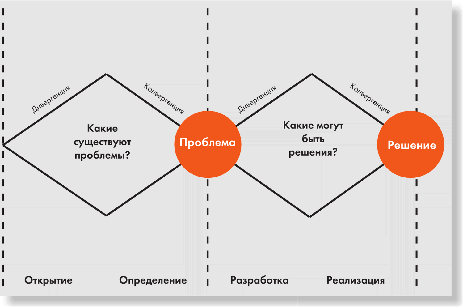 В дизайн-мышлении существует простая визуальная карта дизайн-процесса, которая называется «Двойной алмаз»[4].