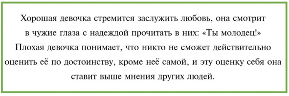 В этой главе мы можем сказать о том, что женщина с дефицитом любви к себе — это прообраз хорошей девочки, которой кажется, что она должна быть идеальной, и только тогда её смогут принять и полюбить. Отсюда вытекает и первый сравнительный вывод.